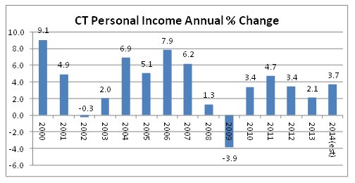 - Based on data released by the Bureau of Economic Analysis on June 24, personal income in Connecticut grew at an annualized rate of 3.7 percent in the 1st quarter of 2014. This ranked Connecticut 16th in quarterly personal income growth. State personal income grew at a rate of 2.1 percent between 2012 and 2013, ranking Connecticut 37th nationally in personal income growth.