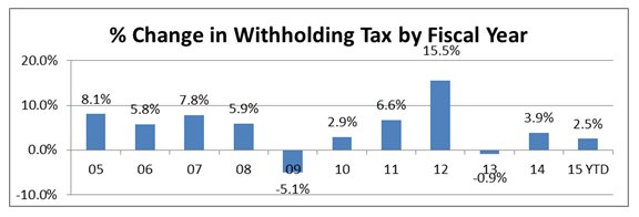 Fiscal Year 2015, withholding receipts have been running slightly below the