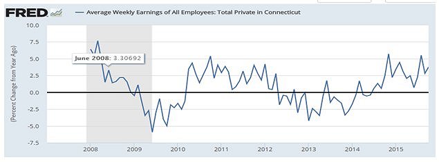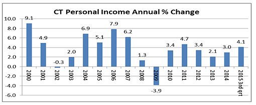 • Based on third-quarter data from the Bureau of Economic Analysis released on Dec. 21, 2015 Connecticut ranks 27th nationally in income growth for the quarter. The chart below shows the 12-month trend in Connecticut personal income, which has yet to attain its past expansionary strength.