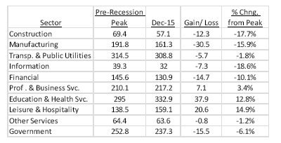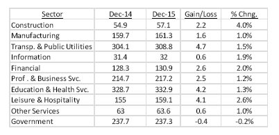 and the December 2015 job totals for each sector. The sectors with the strongest