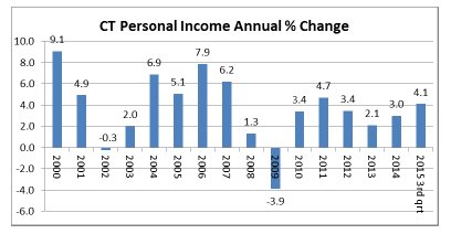 • Based on third-quarter data from the Bureau of Economic Analysis released on Dec. 21, Connecticut ranks 27th nationally in income growth for the quarter. The chart below shows the 12-month trend in Connecticut personal income, which has yet to attain its past expansionary strength.