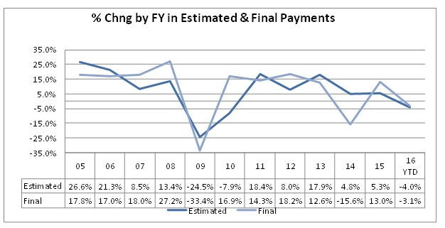 • At the end of January, year-to-date estimated and final income tax payments for Fiscal Year 2016 were negative as compared to last fiscal year. Over the past 11 fiscal years, estimated and final payments moved in opposite directions twice. The current negative trend in estimated payments through the Jan. 15 filing date raises concerns about final April receipts.