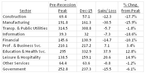• Connecticut’s nonfarm jobs recovery is now 70 months old and is averaging about 1,524 jobs per month since February 2010. The table below looks at peak employment by job sector before the recession and the December 2015 job totals for each sector. The sectors with the strongest job additions, Education and Health Services and Leisure and Hospitality pay wages that are below the statewide average; whereas, sectors with losses such as Manufacturing and Financial Services have pay rates well above the statewide average.