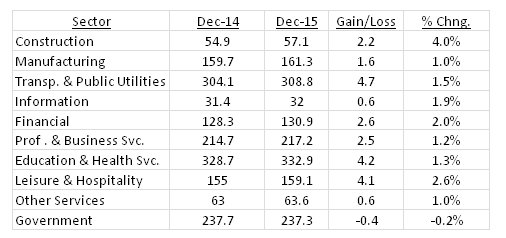 • Labor market information for January and February will not be available until later in March. According to the Department of Labor, December nonfarm employment estimates from the U.S. Bureau of Labor Statistics (BLS) payroll survey (seasonally adjusted) indicated that Connecticut gained 300 jobs in December bringing payroll employment to a level of 1,700,700. November’s original estimate of 5,100 job gains improved to a gain of 5,800 jobs. Connecticut has now increased nonfarm employment by 22,600 (1.35 percent) in calendar year 2015 averaging 1,883 jobs per month during the year.