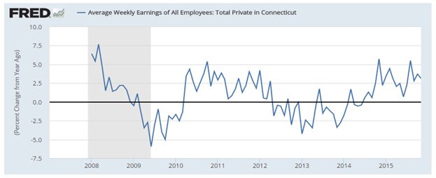 • The graph below shows the monthly percent change from the prior year in Connecticut private-sector weekly earnings. Since the start of Fiscal Year 2015, Connecticut has experienced positive growth in wages, although still below the pre-recession growth levels.