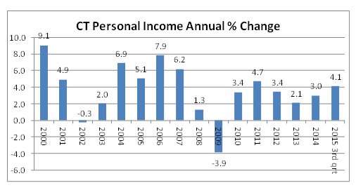 • Based on third-quarter data from the Bureau of Economic Analysis released on Dec. 21, 2015 Connecticut ranks 27th nationally in income growth for the quarter. The chart below shows the 12-month trend in Connecticut personal income, which has yet to attain its past expansionary strength. Data for the fourth quarter will be released on March 24.