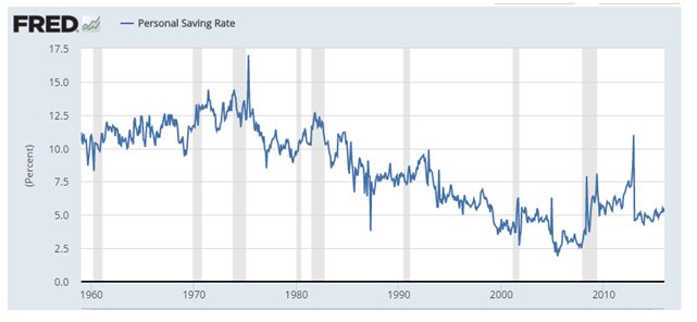 • The personal savings rate ended in 2015 about where it began. The rate in December was 5.5 percent, and it began the year at 5.3 percent. The personal savings rate has been on a general downward trajectory over the past 50 years. The savings rate tends to increase during recessionary periods as consumers become more cautious. The shaded areas on the graph below represent recessions.