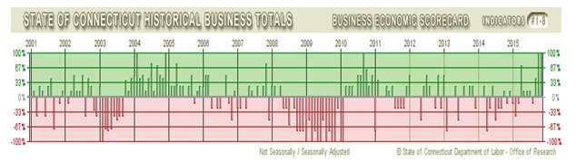 • In Connecticut, the business trends tracked by the Department of Labor – which include housing permits, exports, gaming slots, visits to major attractions, air passenger count, CT manufacturing production index, and weekly hours – had been on an upward trend as 2015 ended.