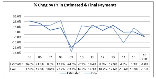 "In nine of the past 11 fiscal years, final payments have moved in the same direction as estimated payments,” Lembo said (see chart immediately below). "This historical pattern raises serious concerns regarding April final payment receipts.”