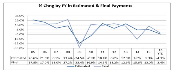 • Estimated and final income tax payments account for approximately 40 percent of total state income tax receipts. At the end of April, year-to-date estimated and final income tax payments for Fiscal Year 2016 were running $83 million lower in actual receipts than last fiscal year. Stock market adjustments that impacted Fiscal Year 2016 receipts were the strongest contributing factor in the decline.