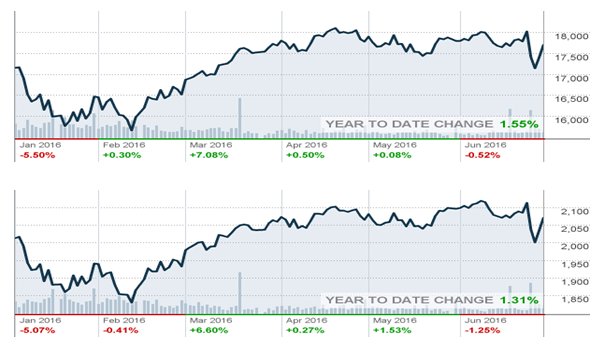 • The graphs below show the year-to-date movement in the DOW and the S&P respectively at this writing. There has been significant market volatility following the Brexit vote.