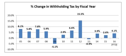 • In Fiscal Year 2016 the withholding portion of the income tax increased 3.4 percent from the prior fiscal year. Through September of Fiscal Year 2017, adjusting for accrual differentials, the withholding tax is exceeding last year’s growth.