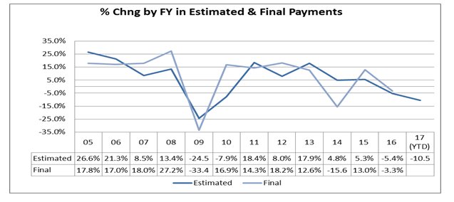 In the third quarter of 2016, estimated income tax payments dropped by over 10 percent from the prior year. Last year and in Fiscal Year 2014, the third-quarter estimated payment pattern reversed sharply for the remainder of the fiscal year as taxpayers adjusted their January payments to recognize their prior year tax liability.
