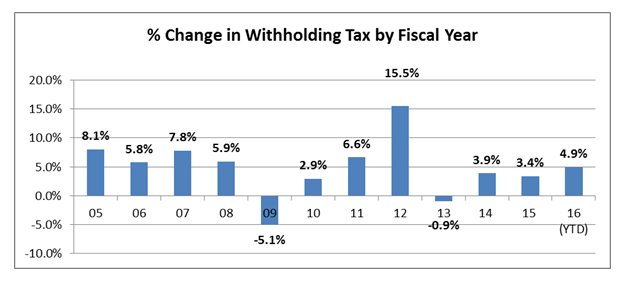 • In Fiscal Year 2016 the withholding portion of the income tax increased 3.4 percent from the prior fiscal year. Through November of Fiscal Year 2017, these receipts are up 4.9 percent from last year. To date withholding collections have been running ahead of last fiscal year throughout the first five months of Fiscal Year 2017 after adjusting for major deposit days within the month.
