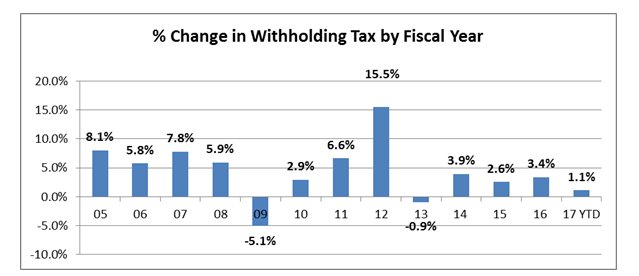 • In Fiscal Year 2016 the withholding portion of the income tax increased 3.4 percent from the prior fiscal year. Through April of Fiscal Year 2017, these receipts were up 1.1 percent from last year. Adjusting for timing differences between fiscal years in deposit days by month, the withholding tax trend has been running below last fiscal year and decelerating in recent months.
