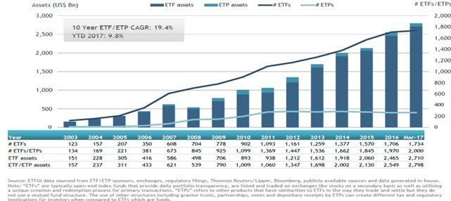 • Some of the diminishment in revenue from capital gains may be attributed to the increasing use by investors of tax-advantaged vehicles such as Exchange Traded Funds (ETF). The increase in these investments is shown in the graph below. Investors may also be awaiting federal tax reform legislation before engaing in large scale selling of equity positions.